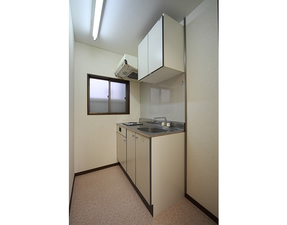 東南角部屋で明るい室内です。標準内装済で、大型エアコンやミニキッチンも完備しています。